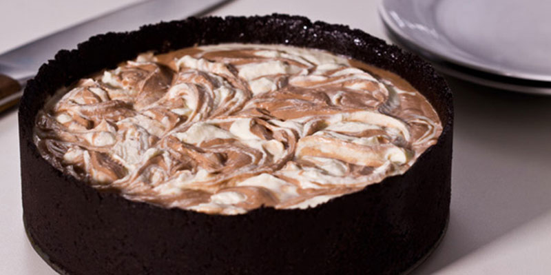 - A hűtőben lévő Oreos alapot kivesszük, és egy nagyobb kanál segítségével felváltva megtöltjük a „fehér” és „csokis” krémekkel. Ha elkészültünk, egy kés segítségével örvényeket formázunk a krémbe.