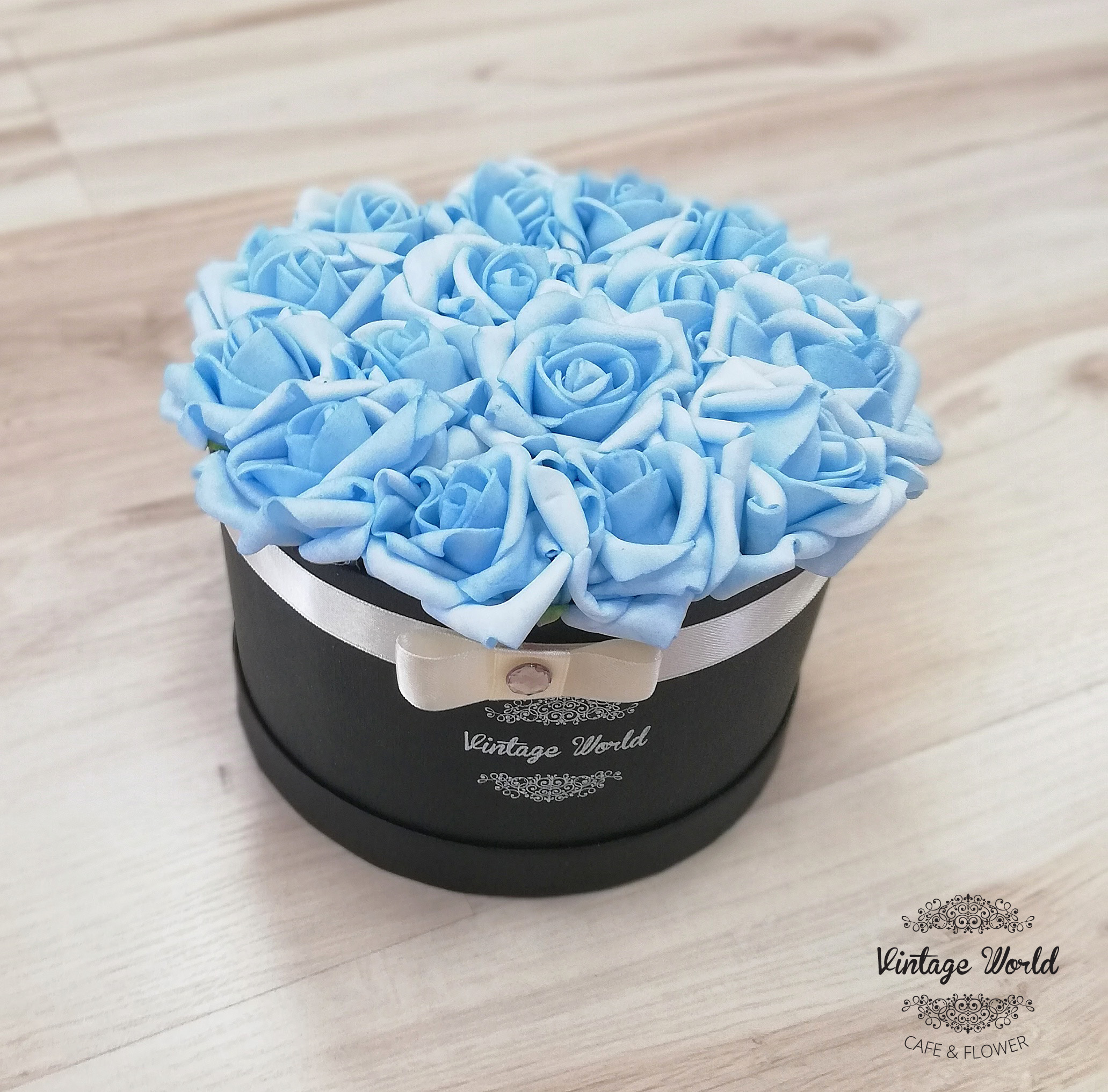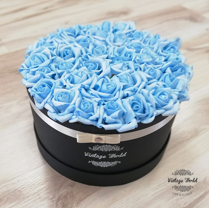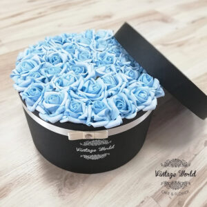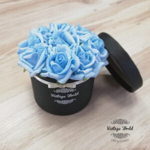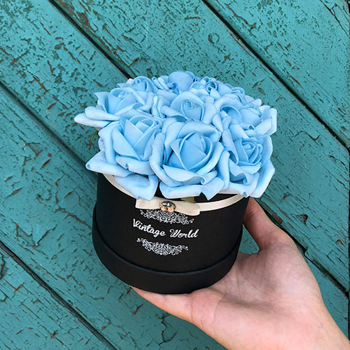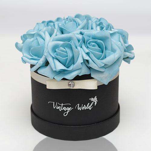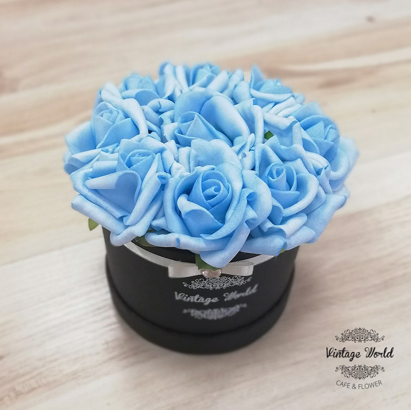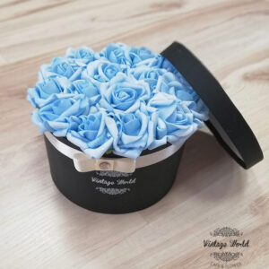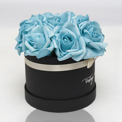 Handmade 9 pieces Athen rose box made of blue foam roses in a black box.