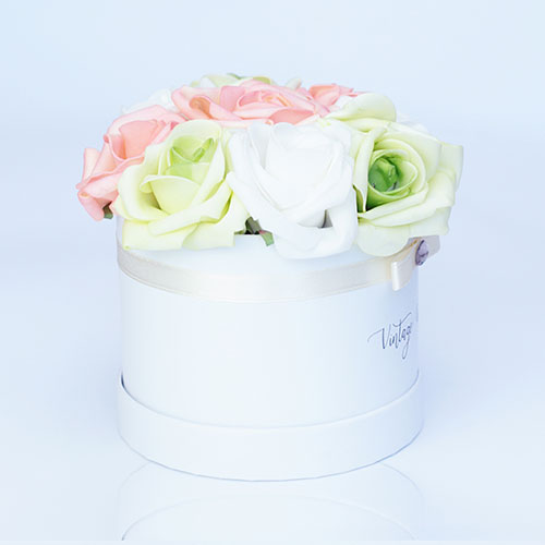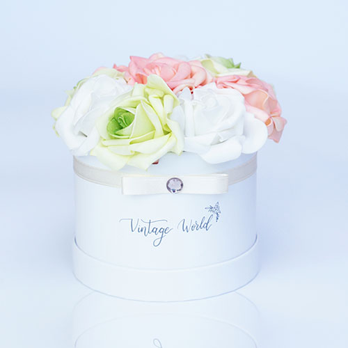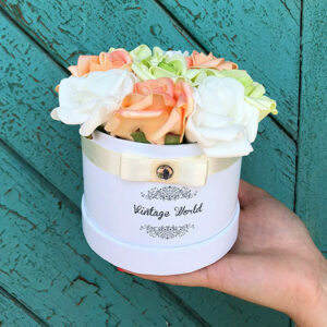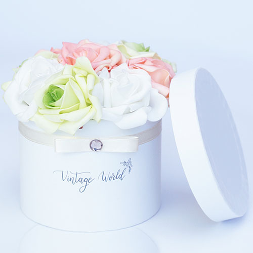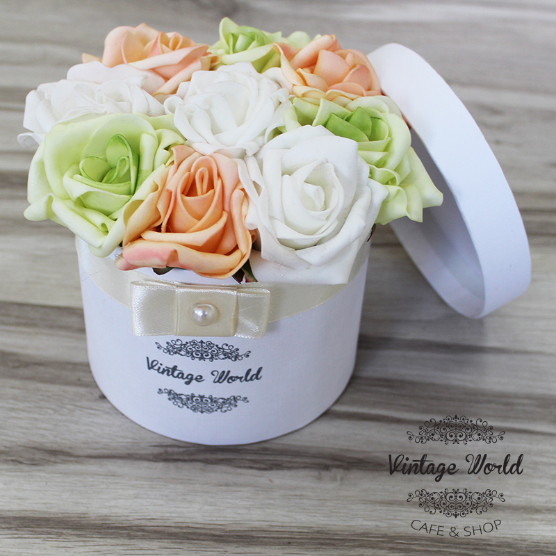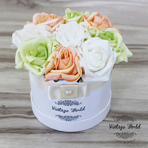 Young, colorful and free: our vibrant 9 pieces Amsterdam foam rose box is just like the capital of The Netherlands. Beautiful and lively colors such as apricot and pistachio green combined with white flowers in a white box: perfect gift to people who love extraordinary presents.