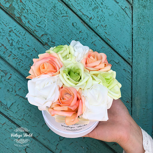 Handmade 9 pieces Amsterdam rose box made of orange, green and white foam roses in a white box.