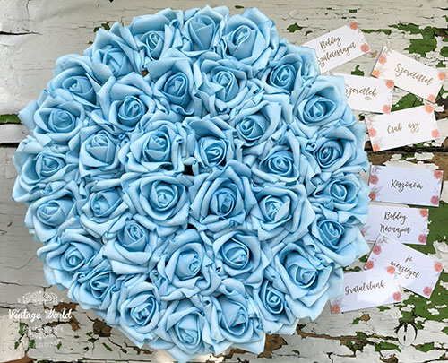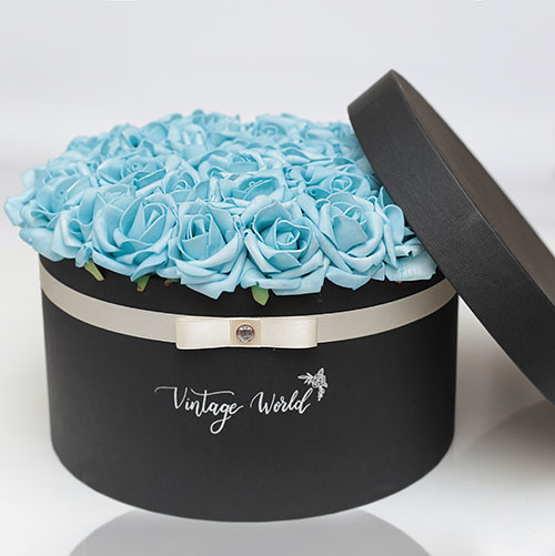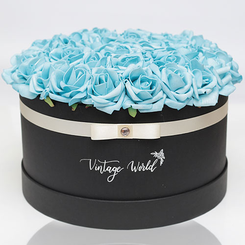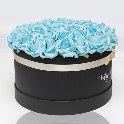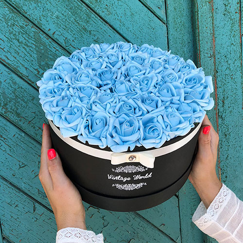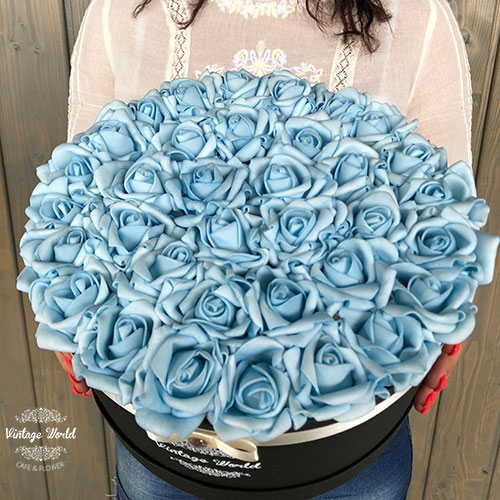 Kézzel készített 35 szálas Athen rózsadoboz kék habrózsákból, fekete dobozban.