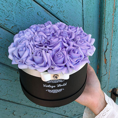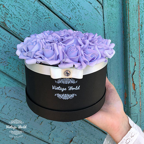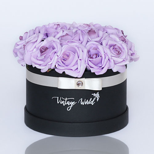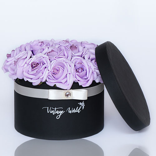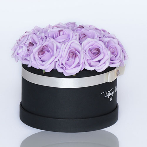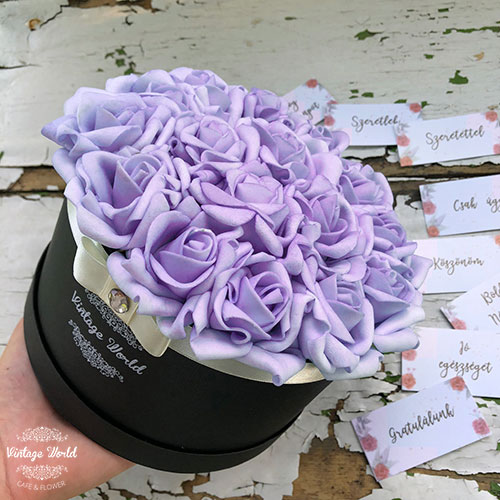 Kézzel készített 16 szálas Cannes rózsadoboz lila habrózsákból, fekete dobozban.
