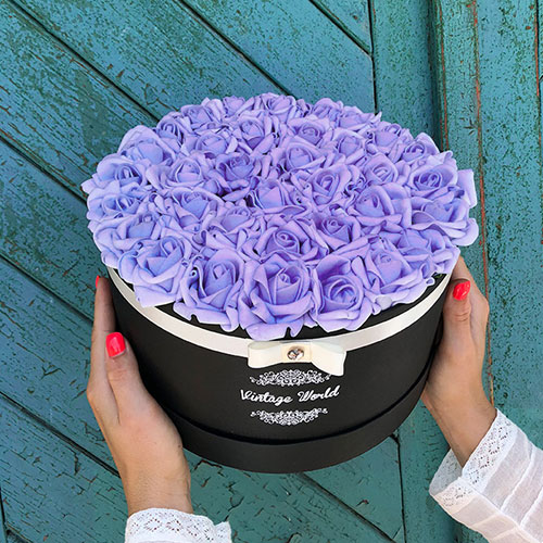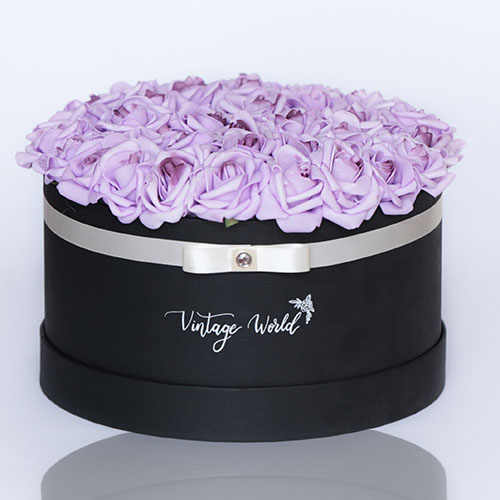 Kézzel készített 50 szálas Cannes rózsadoboz lila habrózsákból, fekete dobozban.