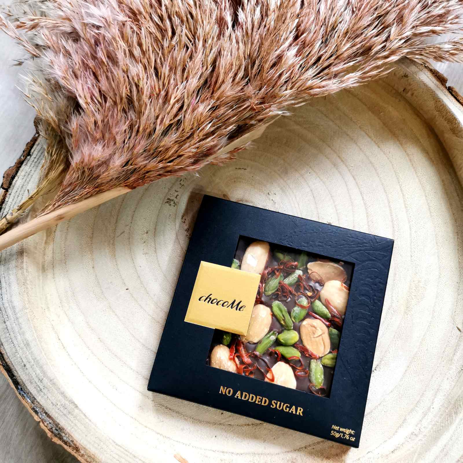 A ChocoMe cukormentes magvas étcsokoládé igazi különlegességként szolgál az édességek kedvelőinek. A chili karikák, brontei pisztácia és szicíliai mandula darabok varázslatos ízharmóniája egyszerre jelenik meg benne.