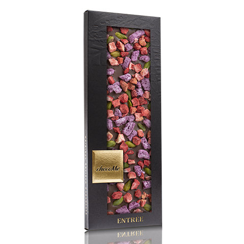 Összetevők: tejcsokoládé, pisztácia, liofilizált eperdarabok, liofilizált kékáfonyás joghurt.