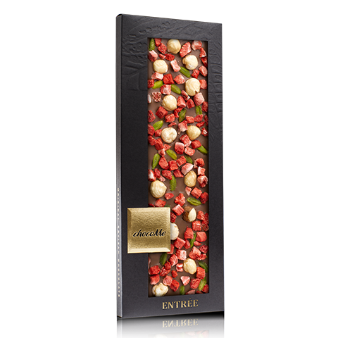 Összetevők: tejcsokoládé, mogyoró, pisztácia, liofilizált eperdarabok.