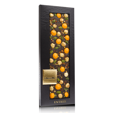 Étcsokoládé, tört chili, narancs ízű csokoládé pasztilla, mogyoró, pisztácia.