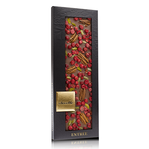 Összetevők: tejcsokoládé, pekándió, liofilizált pirosribizli, pisztácia.