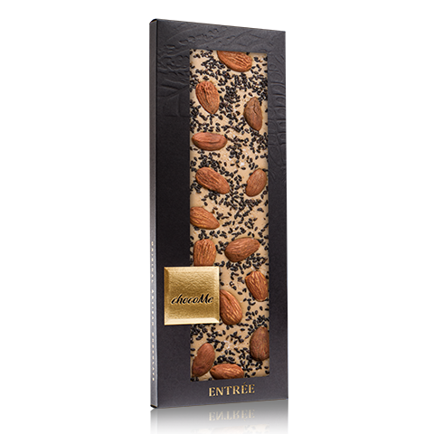 Fehércsokoládé, só, fekete szezámmag, mandula.