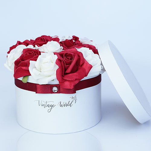 Kézzel készített 16 szálas Debrecen rózsadoboz vörös és fehér habrózsákból, fehér dobozban.