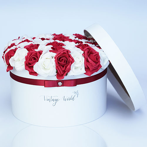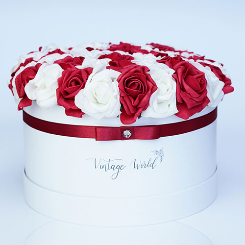 Kézzel készített 50 szálas Debrecen rózsadoboz vörös és fehér habrózsákból, fehér dobozban.