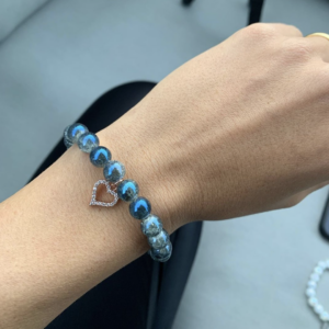 ‘Dosoel’ csillogó kék angyalaura karkötő. Ez az ékszer egyszerre gyönyörű és energetikailag különleges, ideális választás elegáns nők számára. Gyönyörű színének és az egyedi, szív alakú charmnak köszönhetően esküvői kiegészítőnek — something blue — is kiváló. Tedd különlegessé a Nagy Napot!