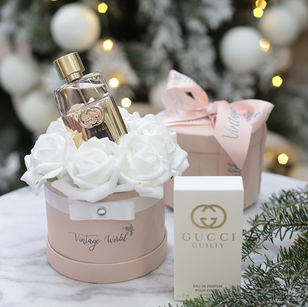We made our handmade Gucci de Luxe flower box from a Gucci Guilty 30ml perfume and 9 white foam roses in exclusive Sydney beige gift box.