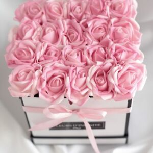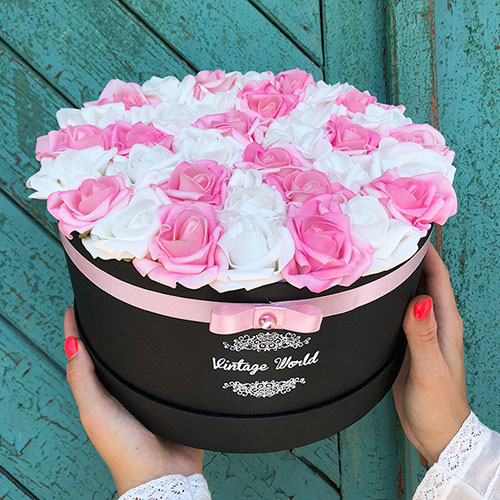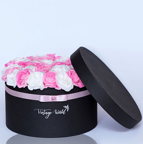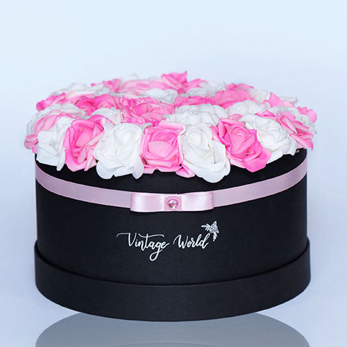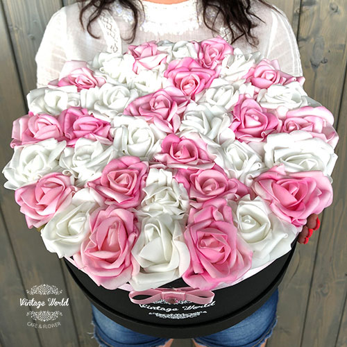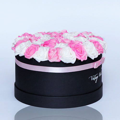 Kézzel készített 35 szálas Hamburg rózsadoboz fehér és rózsaszín habrózsákból, fekete dobozban.