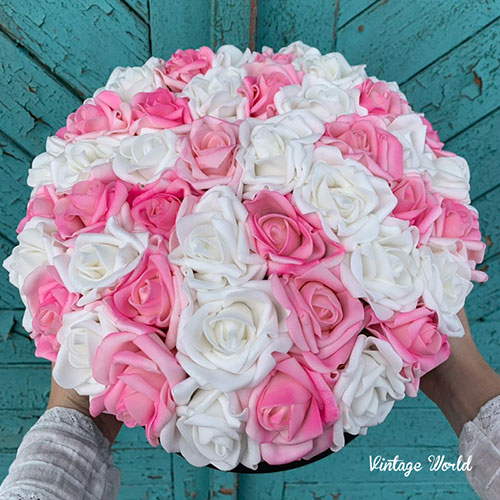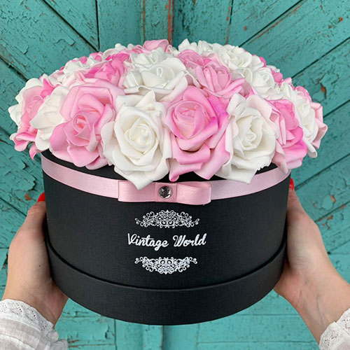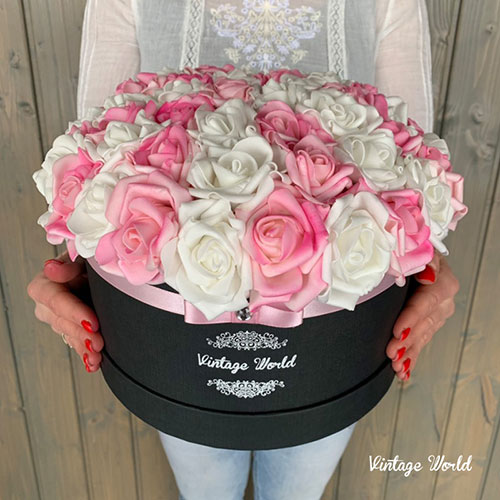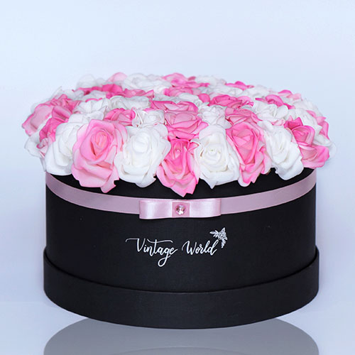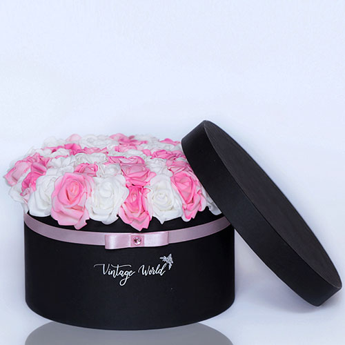 Kézzel készített 50 szálas Hamburg rózsadoboz fehér és rózsaszín habrózsákból, fekete dobozban.