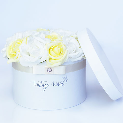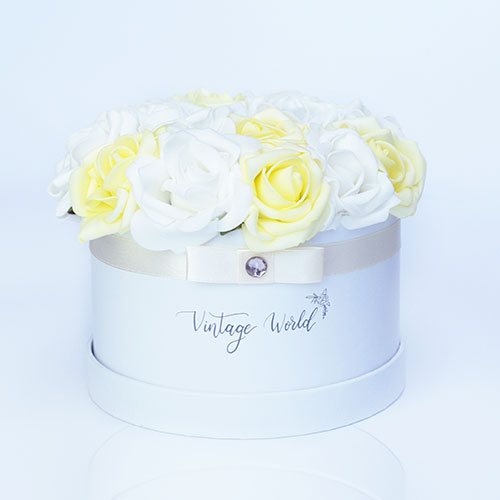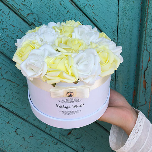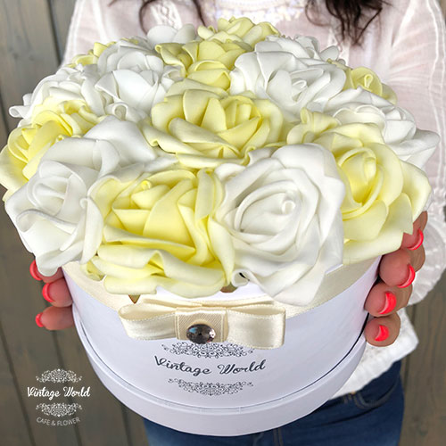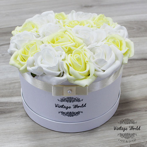 Kézzel készített 16 szálas Kassa rózsadoboz fehér és citromsárga habrózsákból, fehér dobozban.