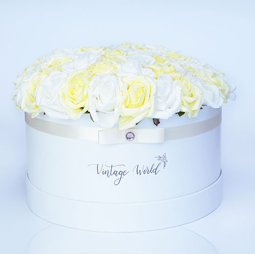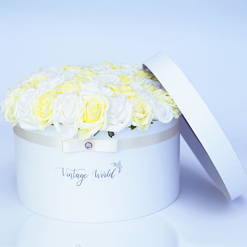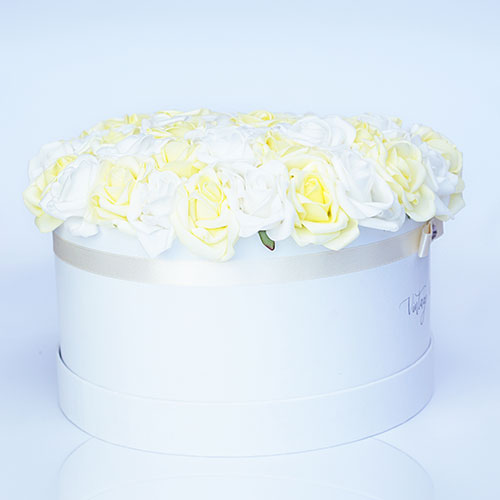 Kézzel készített 50 szálas Kassa rózsadoboz fehér és citromsárga habrózsákból, fehér dobozban.