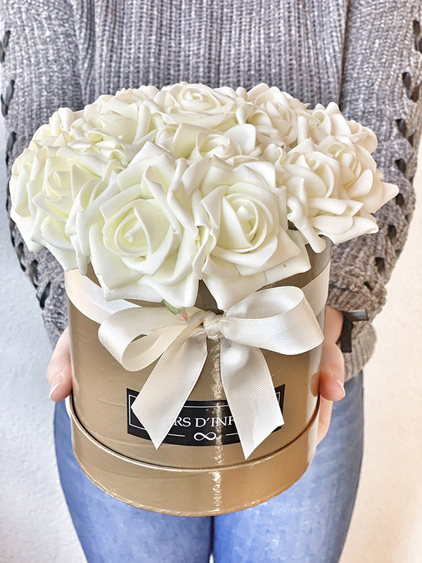 Kívánság habrózsa doboz • Fleurs d’Infinité, azaz a végtelen virágai: 18 meseszép, soha el nem hervadó tört fehér habrózsa egy egyedi, arany színű, magasított dobozba rejtve. Fejezd ki érzéseidet és lepd meg szerelmedet, szeretteidet ezzel az egyedi, örökké virágzó ajándékkal! Csodás választás anyák napjára, ballagásra, kitűnő születésnapi vagy névnapi meglepetés a számodra legfontosabbaknak.