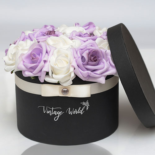 Kézzel készített 16 szálas Marseille rózsadoboz lila és fehér habrózsákból, fekete dobozban.