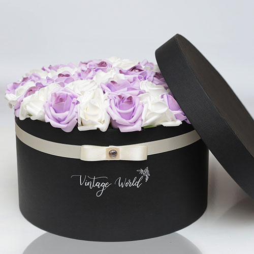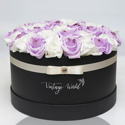Kézzel készített 35 szálas Marseille rózsadoboz lila és fehér habrózsákból, fekete dobozban.