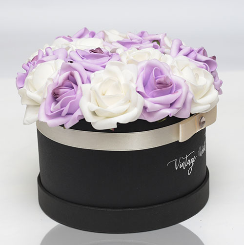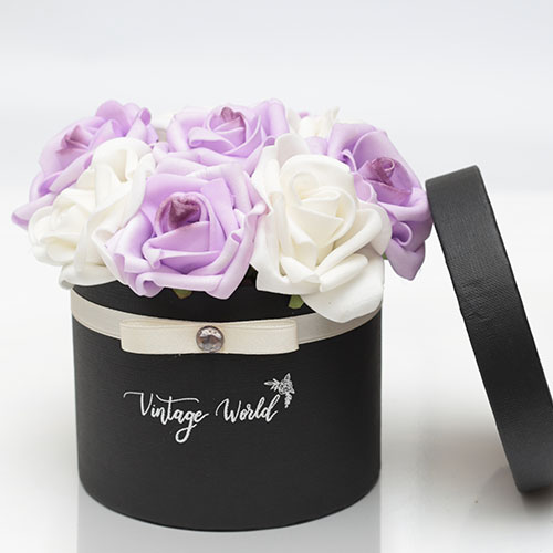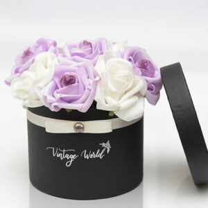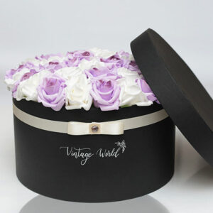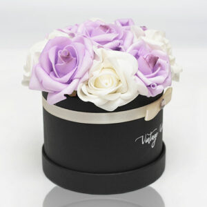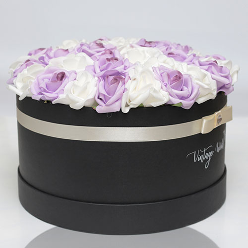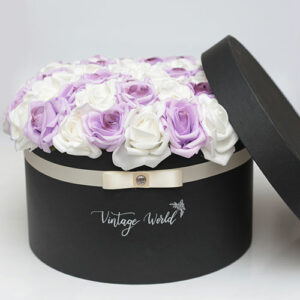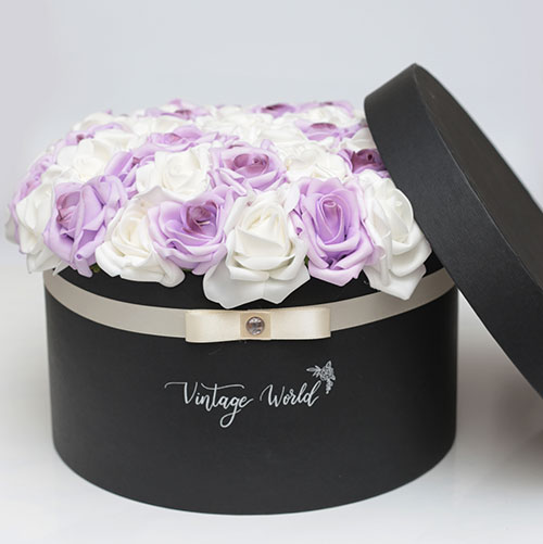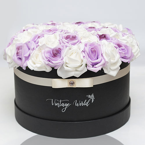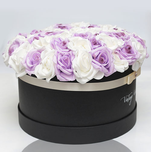 Kézzel készített 50 szálas Marseille rózsadoboz lila és fehér habrózsákból, fekete dobozban.