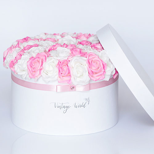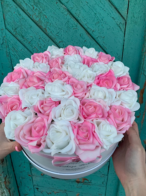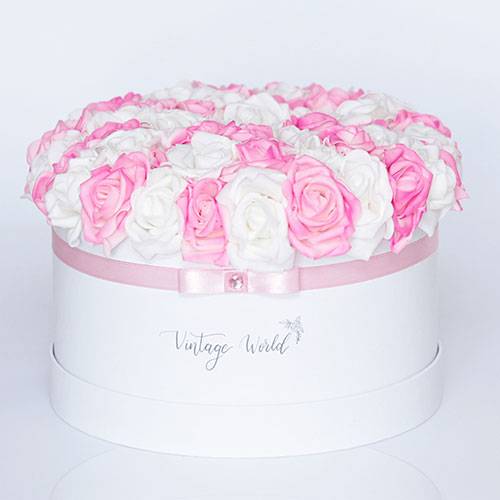 Kézzel készített 35 szálas Miami rózsadoboz fehér és rózsaszín habrózsákból, fehér dobozban.