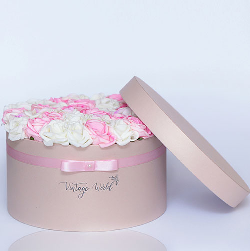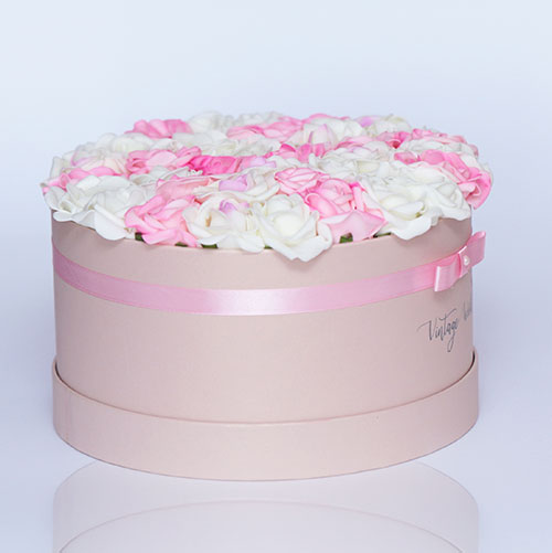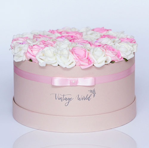Kézzel készített 35 szálas Milano rózsadoboz fehér, rózsaszín és lila közepű habrózsákból, bézs dobozban.