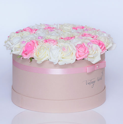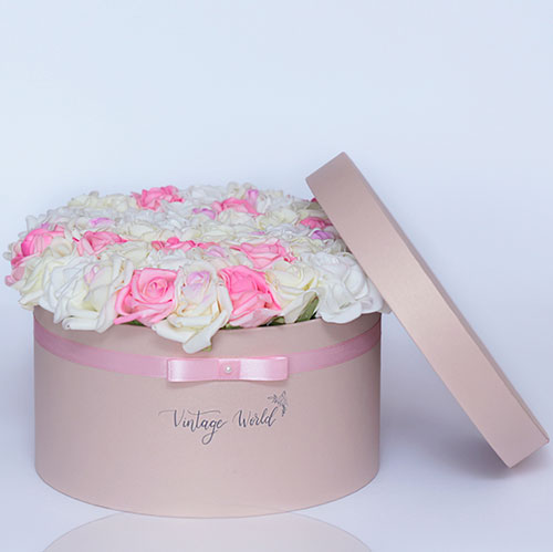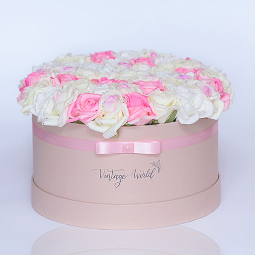 Kézzel készített 50 szálas Milano rózsadoboz fehér, rózsaszín és lila közepű habrózsákból, bézs dobozban.