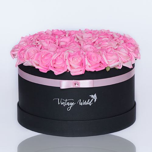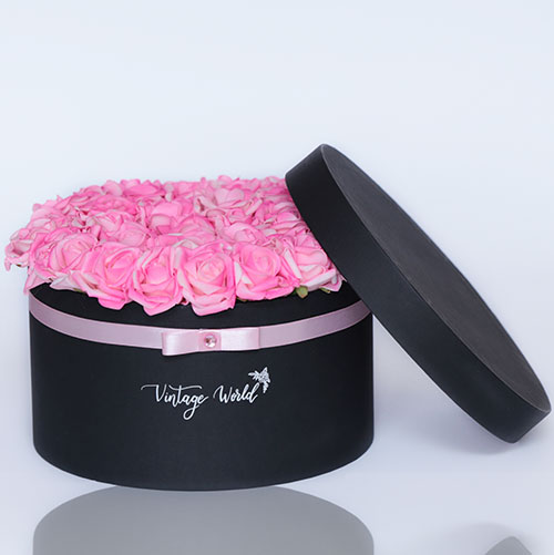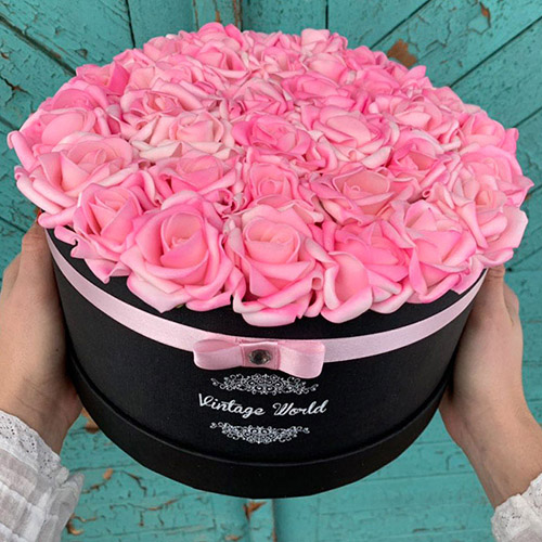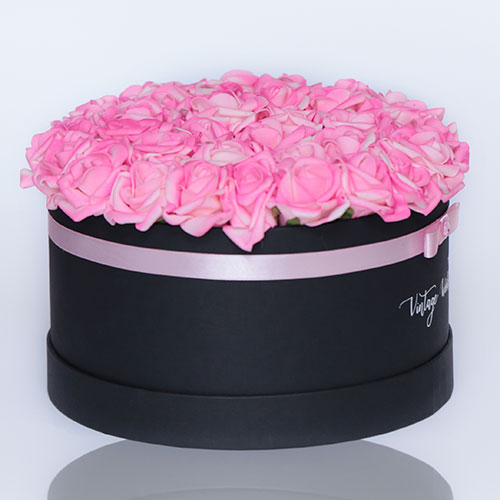 Kézzel készített 35 szálas Moscow rózsadoboz rózsaszín habrózsákból, fekete dobozban.