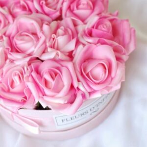 Kézzel készített 16 szálas New York rózsadoboz rózsaszín habrózsákból, fehér dobozban.