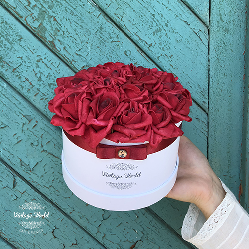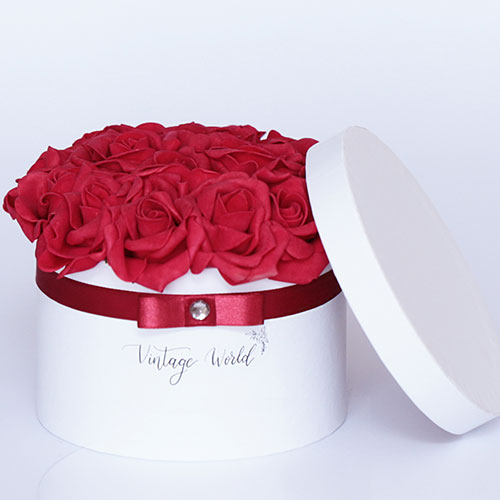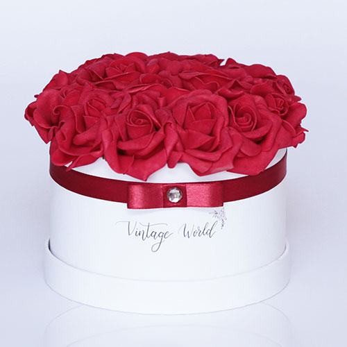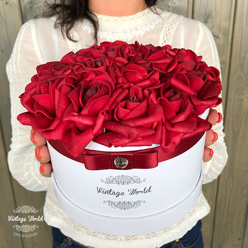 Kézzel készített 16 szálas Paris rózsadoboz vörös habrózsákból, fehér dobozban.