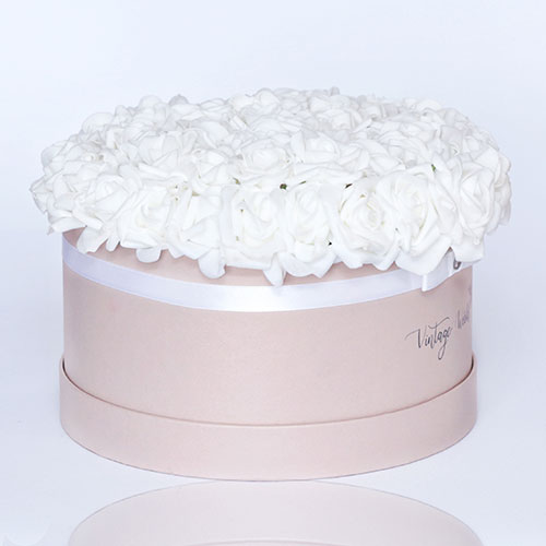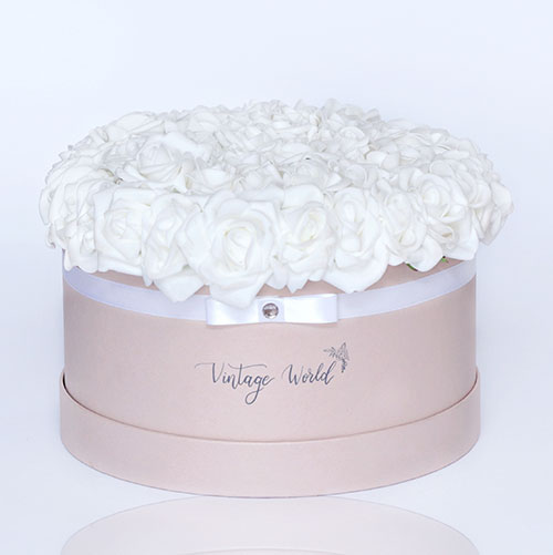 Kézzel készített 50 szálas Sydney rózsadoboz fehér habrózsákból, bézs dobozban.