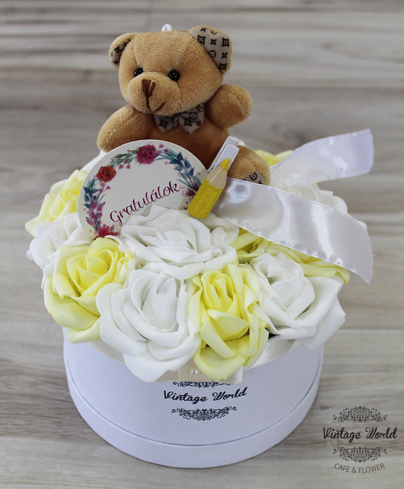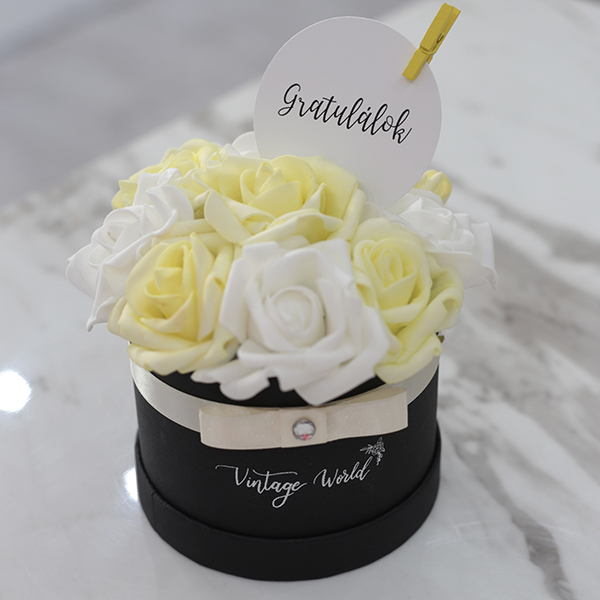 Kézzel készített 9 szálas Ünnepi rózsadoboz fehér és sárga habrózsákból, fekete dobozban, csipesz díszítéssel.
