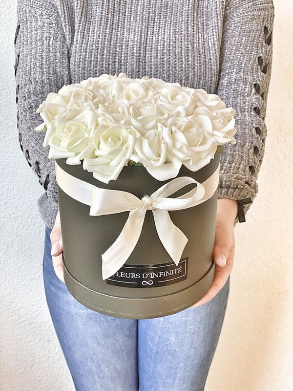 Örök Élmény közepes habrózsa doboz • Fleurs d’Infinité, azaz a végtelen virágai: 20 meseszép, soha el nem hervadó tört fehér habrózsa egy egyedi, sötétszürke színű, magasított dobozba rejtve. Fejezd ki érzéseidet és lepd meg szerelmedet, szeretteidet ezzel az egyedi, örökké virágzó ajándékkal! Csodás választás anyák napjára, ballagásra, kitűnő születésnapi vagy névnapi meglepetés a számodra legfontosabbaknak.