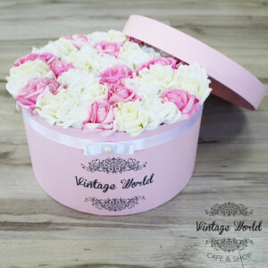 Kézzel készített 35 szálas Zagreb rózsadoboz fehér, tört fehér és rózsaszín habrózsákból, rózsaszín dobozban.